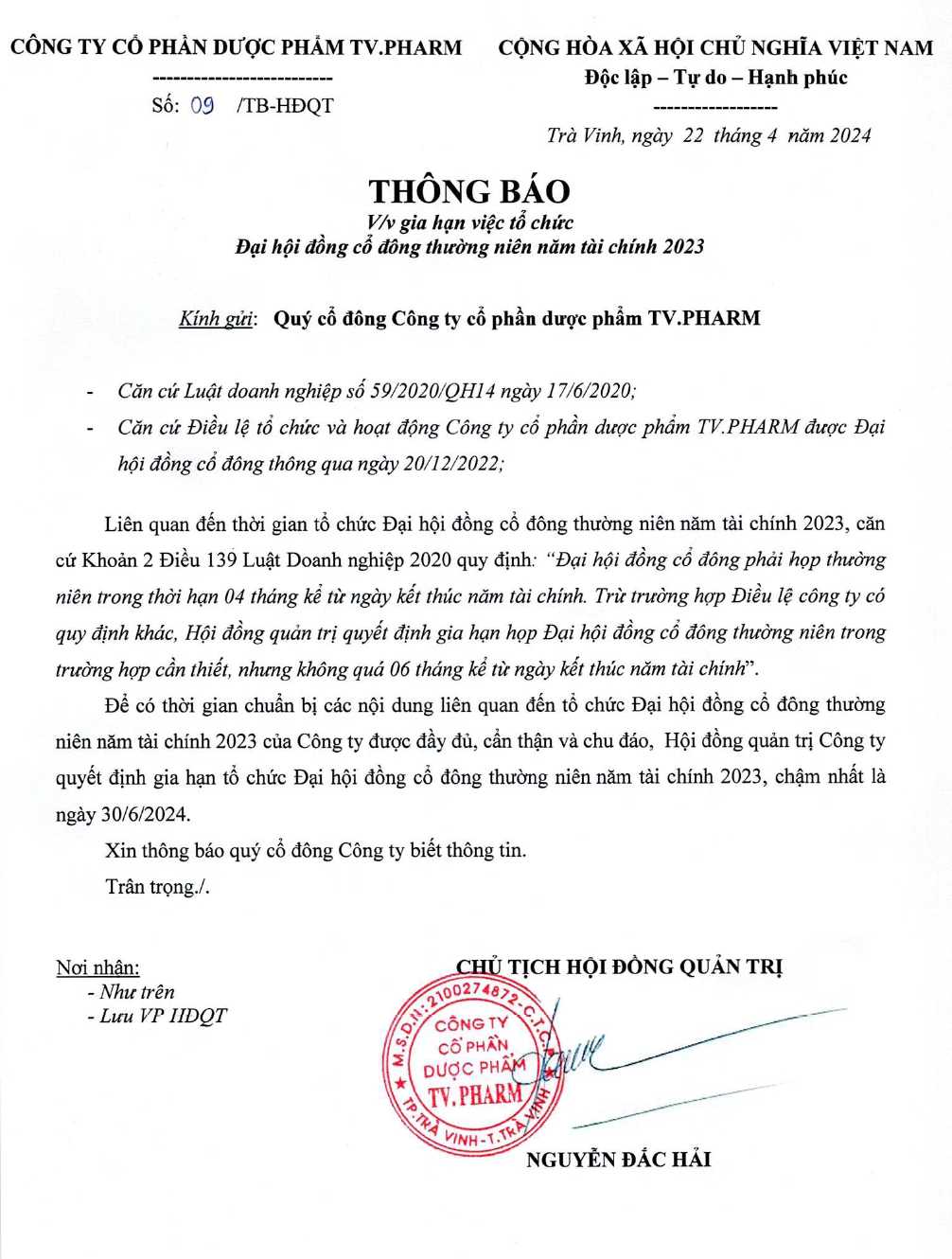(22/04/2024) Thông báo gia hạn việc tổ chức đại hội đồng cổ đông thường niên năm tài chính 2023